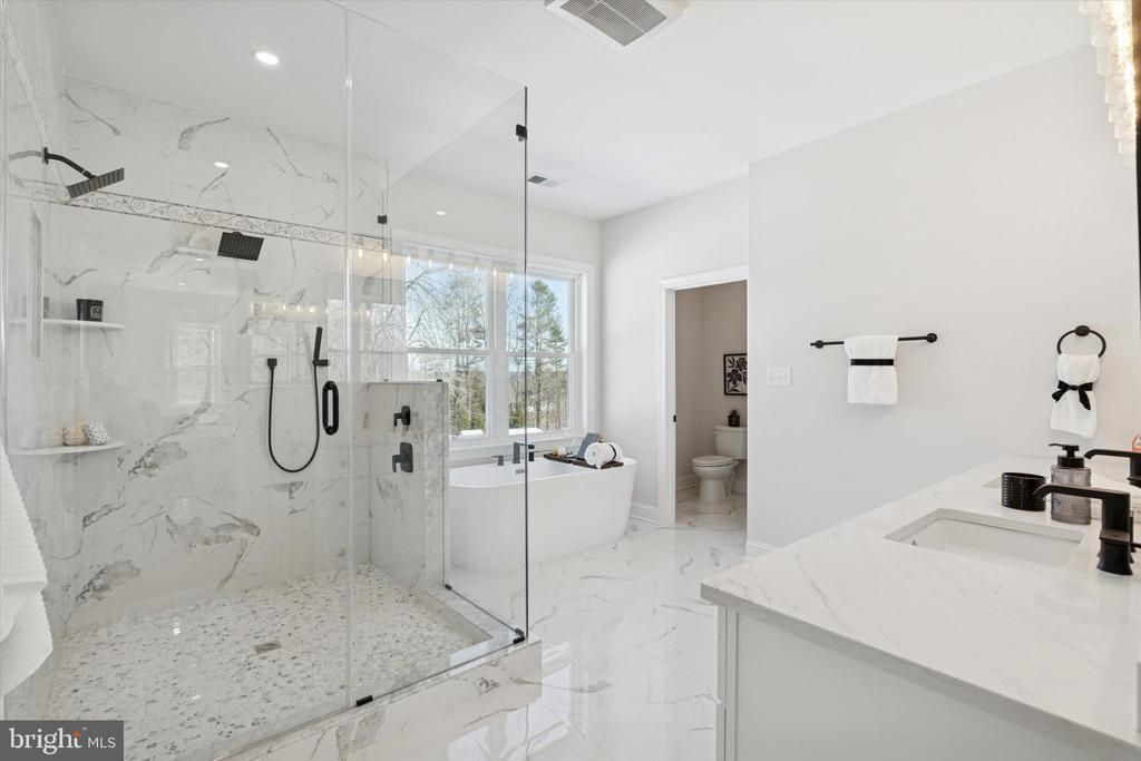 Welcome to this stunning 3,650 sq ft residence set on an oversized double portfolio lot measuring 100x150, offering a rare combination of privacy, space, and flexibility. Enjoy low real estate taxes of just $8,707 and no HOA fees. The home has been completely remodeled with high-end finishes throughout, showcasing exceptional craftsmanship and thoughtful design. The main level features a versatile second suite ideal for in-law quarters, a private study, or In Law Suite. With four bedrooms, three full baths, and one half bath, the layout is both functional and spacious. The exceptionally large primary suite includes a sitting area and a luxurious custom glass, floor-to-ceiling shower. The custom kitchen is a showstopper with bespoke cabinetry, waterfall quartz countertops, and a full dry bar with wine cooler—perfect for entertaining. A gorgeous, light-filled family room offers sweeping views and direct access to a massive wraparound deck. The partially finished, full walkout basement is filled with natural light and includes a second laundry setup, complementing the convenient second-floor laundry. Step outside to a deep, private rear yard with mature landscaping in a truly secluded setting. Ample parking accommodates both residential and commercial vehicles. A rare offering that seamlessly blends luxury, versatility, and privacy—this exceptional property is truly a must-see to be fully appreciated.